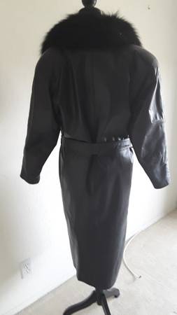 Long leather coat, straight cut with belt tie, nice warm fur collar. Approximately knee length. Pockets on either side.