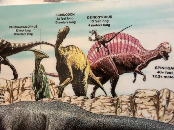 Also included is a Dinosaurs Through The Ages Educational Placemat. It features 15 different dinosaurs with their names, time periods (Triassic, Jurassic, and Cretaceous), and sizes. The placemat is laminated and water-resistant. The front is in full color, while the back features a black-and-white outline of the images for coloring with dry-erase markers. It is designed as a learning tool for children and is dated 1996.