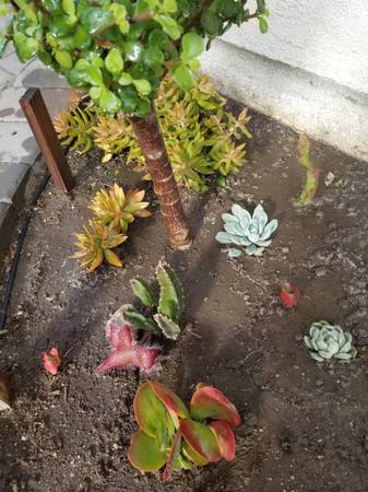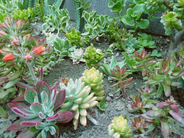 In general, succulents can do with minimum water. I keep these plants trimmed and plant clippings will root once they are put in the ground. Almost all of mine have been started from clippings from originally purchased plants. At Green Thumb I believe they charge a lot for just a little 2" pot. I don't have pots so best to bring a container or I will give them to you in grocery bags or a boxes.