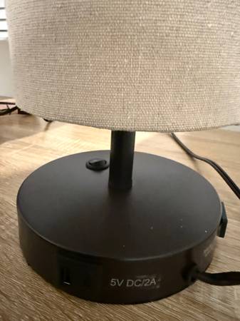 1) 3 brand new cylindrical Heyburn lamps, with oatmeal shade and bronze base (20" tall and 6.25" wide). The base has an on-off switch, USB-A and USB-C ports, and an electrical outlet.