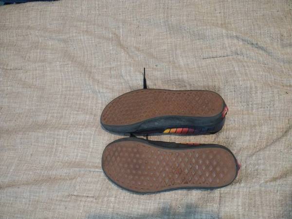 For sale is a used pair of boys Vans shoes that are in good used condition. These Vans are marked men's 4.5 and women's 6.0. and feature total black top and a mix of colors that are striped on the top which range from yellow to Blue and include Orange and purples. These Vans are in good used condition and show very little signs of wear. These shoes are used and may show stains, wear, imperfections and other blemishes. Does not come with show box. Why pay retail get them for less! Prices $25 call Jason to arrange for pickup show contact info