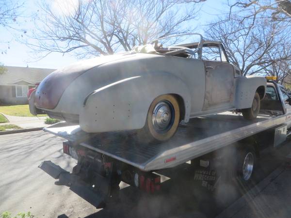 1941 Cadillac Series 62 convertible coupe. Car is complete, including factory original fender skirts, but needs total restoration. $12,500.00. .