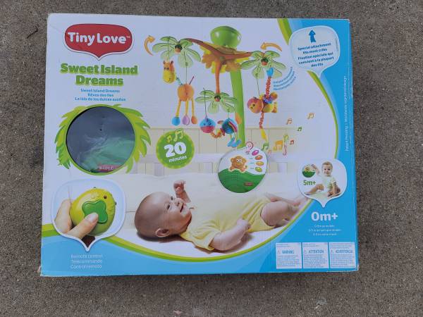The Tiny Love Sweet Island Dreams Mobile is a unique mobile with an arch designed like a tree trunk and green leafy branches that extend outwards. The mobile features three adorable characters that dance independently to the sound of soothing music. The characters are a giraffe, a monkey, and a bird. The mobile requires three C 1.5V batteries, which are not included.